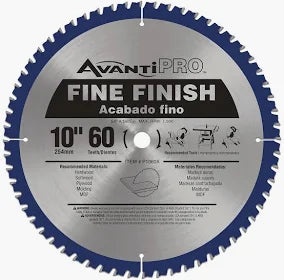 The Avanti PRO Fine Finish 10'' saw blade features 60 precisely engineered teeth designed for smooth, clean cuts on wood and composite materials. Its fine tooth count ensures minimal splintering and enhanced surface quality, making it ideal for finish carpentry and detailed woodworking projects. Compatible with standard 10-inch saws, this blade delivers expert-level cutting performance and durability for professional results.
