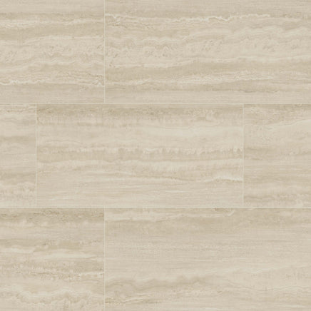 Assos presents a large-format 24" x 48" matte porcelain tile inspired by vein-cut travertine. Its warm hues of soft gold and rich brown emphasize linear veining, delivering an authentic natural stone appearance with realistic texture. The matte surface enhances a calm ambiance, making it perfect for expansive floor areas, bathrooms, and feature walls.