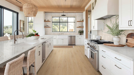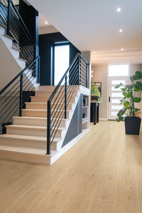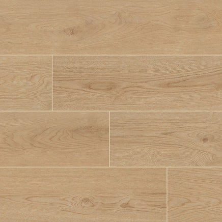 Cabana Blonde porcelain tile features a large 9” x 47” format with natural blonde wood tones and realistic grain patterns. Its matte finish and pressed edges create clean grout lines, ideal for floors and walls. Durable and resistant to water, scratches, and stains, this tile combines the beauty of wood with the low maintenance of porcelain.