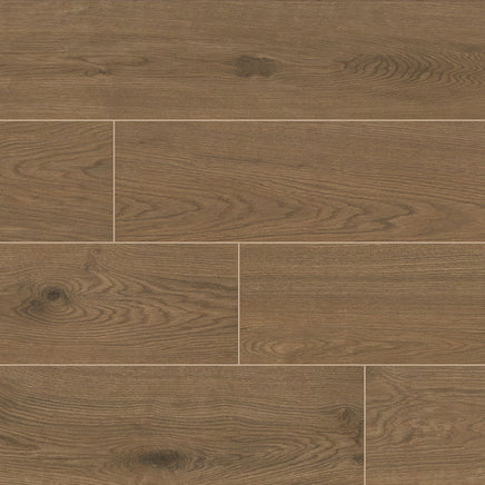 Cabana Honey porcelain tile features a large 9” x 47” size with natural wood-like brown tones and varied grain patterns for an authentic look. Its matte finish and pressed edges create seamless grout lines, ideal for floors and walls. Durable and resistant to water, scratches, and stains, this tile combines the beauty of wood with the strength of porcelain for lasting use in any space.