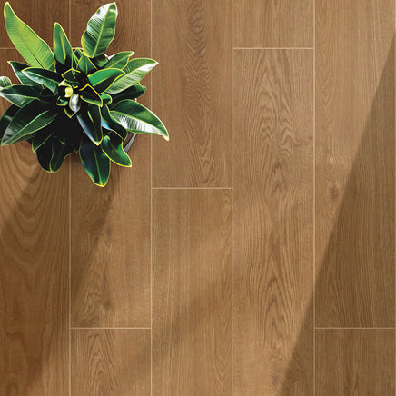Cabana Tawny porcelain tile offers a large 9” x 47” format with natural orangish-brown wood tones and realistic grain patterns. Its matte finish and pressed edges create seamless, sophisticated surfaces ideal for floors and walls. Durable and resistant to water, scratches, and stains, this tile combines the beauty of wood with the strength of porcelain for lasting use in any space.