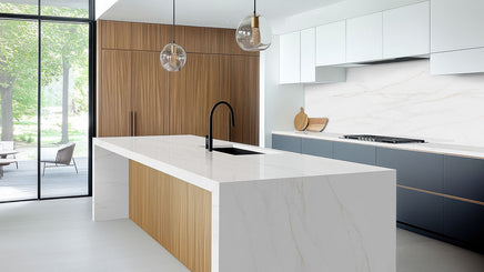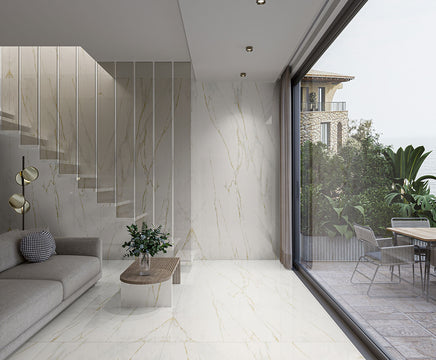 Calacatta Corrinna, crafted in Italy, features delicate veins set against a luminous white base with subtle warm tones. Its silk finish minimizes glare, creating a refined and understated look. This 63” x 126” porcelain slab, 12mm thick, offers durability and can be book-matched to achieve a seamless, luxurious design. Resistant to stains, moisture, heat, and frost, it is suitable for both indoor and outdoor use.