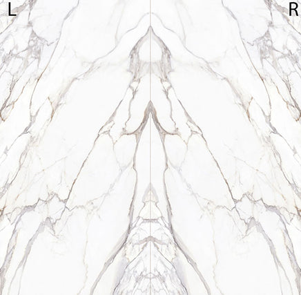 Calacatta Fiorella is an Italian-made porcelain slab with a warm white background and gray and gold veins. Its silk finish reduces glare and feels smooth. Measuring 63” x 126” and 12mm thick, it resists stains, water, heat, and frost, suitable for indoor and outdoor use.