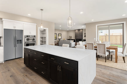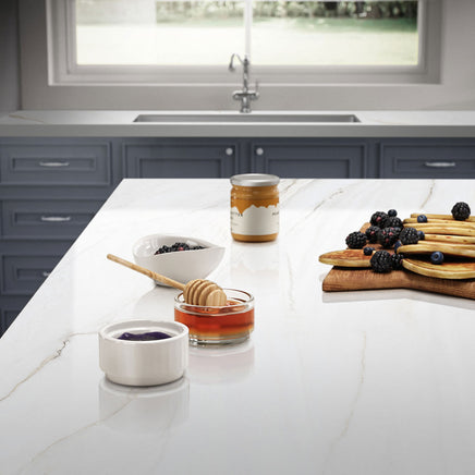 Calacatta Montasia™ Porcelain Slab from Italy combines white and gray tones in a polished 2cm thick surface. Durable and elegant, it resembles “Zermat” quartzite, making it perfect for upscale design projects.