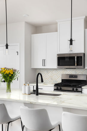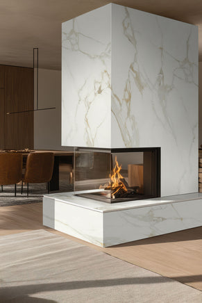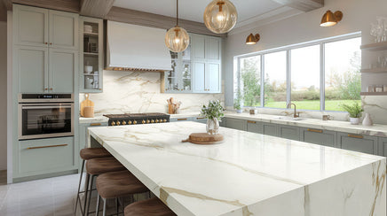 Calacatta Prici™ is a 2cm thick polished porcelain slab from Italy that mimics Calacatta Gold Marble’s white background with gray and gold veins. Its durable surface is ideal for elegant countertops and backsplashes.