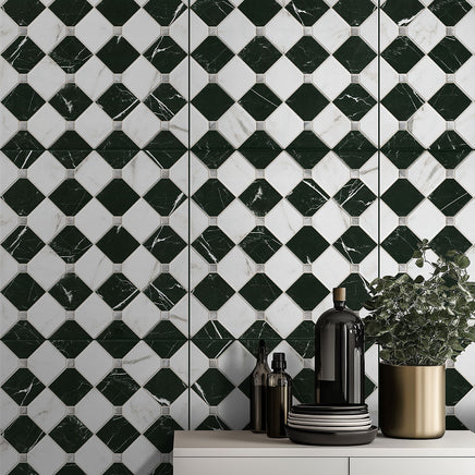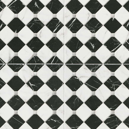 Casa Tuxedo is a 17" x 17" matte porcelain tile featuring a classic checkerboard pattern with three marble-inspired designs. Its soft matte finish and bold geometry add elegance and depth, making it ideal for entryways, floors, and feature walls. This tile combines vintage style with modern sophistication for a striking look