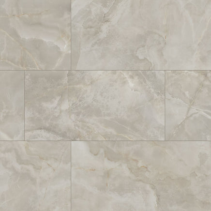 The Alura Porcelain Tile, sized at 24” x 48”, highlights the elegant onyx pattern with soothing beige hues and prominent veining. Featuring a polished finish and precisely cut rectified edges, it ensures smooth installation with reduced grout visibility. Ideal for both residential and commercial floors and walls, this tile merges refined style with functional design for any interior setting.