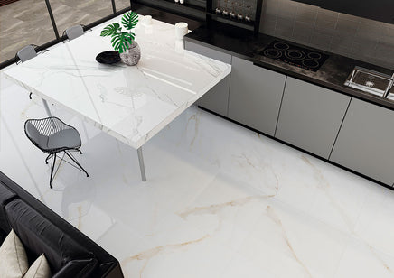 Marbello Porcelain tile features a large format design showcasing creamy white marble sophistication. Ideal for expansive wall features or stylish kitchen and bathroom floors, this rectified tile combines durability with versatility for both indoor and outdoor use. Available in matte or polished finishes, Marbello delivers a timeless and refined aesthetic.