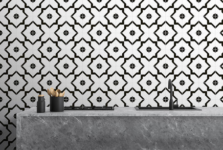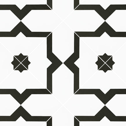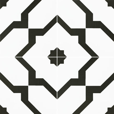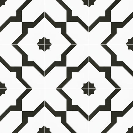 Transform your space with the elegant Gia Encaustic Tile from the Zaria Collection. Featuring a sleek black and white floral geometric design, these handcrafted tiles fit together perfectly to form a unified pattern. Durable and low-maintenance, they are ideal for busy areas such as floors, countertops, walls, and backsplashes. Enhance your home’s style and functionality with the Gia Porcelain Tile today.