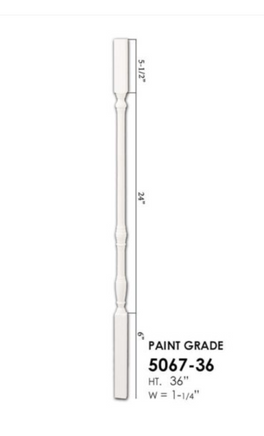 This is a painted white wooden baluster with a traditional style turning and a block on top and bottom.