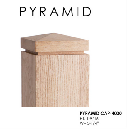 This part PYRAMID CAP-4000 is a pyramid designed cap that fits on 3-1/4″ newel posts and measures 1-9/16″ tall by 3-1/4″ wide.