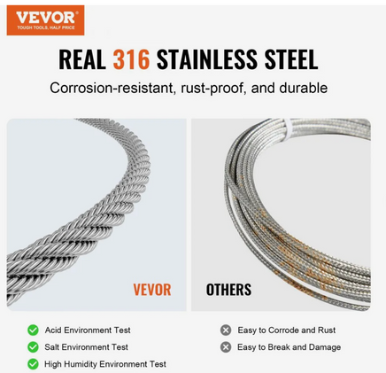 - Rust and Corrosion Resistance: Our 600 ft (182.3 m) steel cable is made of premium T316 stainless steel with added molybdenum that comes with a better performance on its breaking strength and anti-oxidation. It is great for outdoor installation that requires a tough quality and longer lifespan.