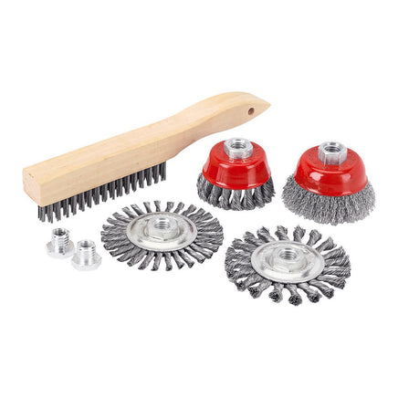 Get a full assortment of wire brushes to clean, scour and finish projects. The grinder brush kit comes with a 3 in. knotted wire cup brush, 3 in. crimped wire cup brush, 4 in. cable twist wire wheel, 4 in. stringer bead wire wheel, 10-3/8 in. wire hand brush with a hardwood handle and two arbor adapters (M10-1.25 and M10-1.50) for a 5/8 in. arbor.. Handle a wide variety of light to tough grinding jobs with these outstanding grinder brushes!