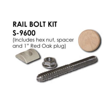 The S-9600 rail bolt kit is used to install indoor handrails and fittings. This kit includes a hex nut, spacer, and 1″ Red Oak plug.