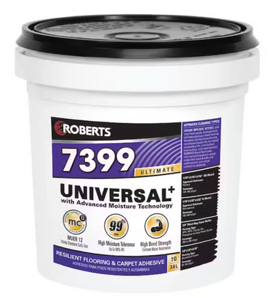 Roberts 7399 Universal Adhesive 1.8L is a high-performance acrylic latex PSA designed for superior bond strength and resistance to shearing and peeling. It is ideal for installing Luxury Vinyl Tile (LVT), Luxury Vinyl Plank (LVP), Vinyl Composition Tile (VCT), rolled vinyl sheet flooring, and vinyl-backed carpet tile. Compatible with properly prepared concrete, APA-rated plywood, OSB underlayment, ceramic tile, cement backerboard, fiber cement underlayment, and terrazzo, this adhesive is suitable for indoor residential and commercial applications. Enhanced with Microban protection, it helps prevent bacteria growth that can degrade the product over time.